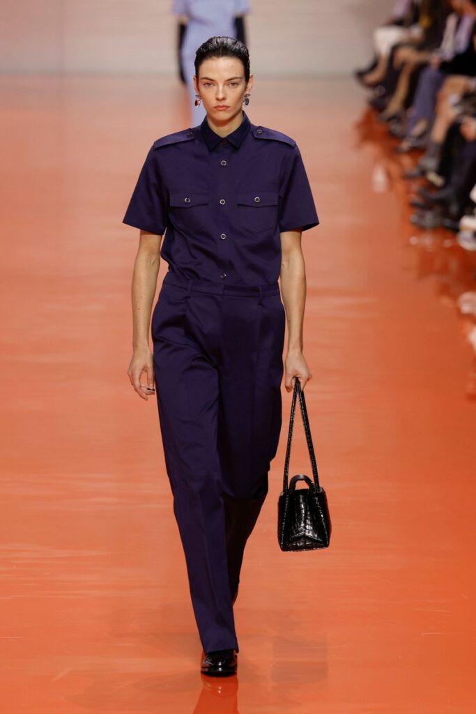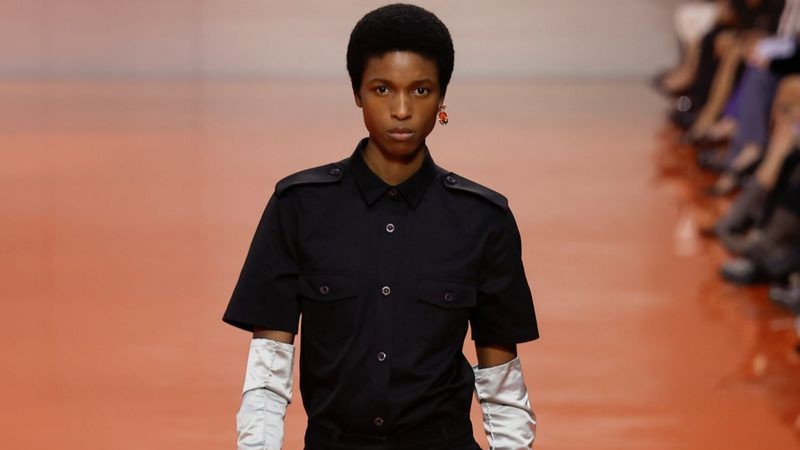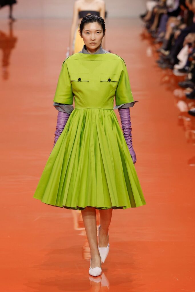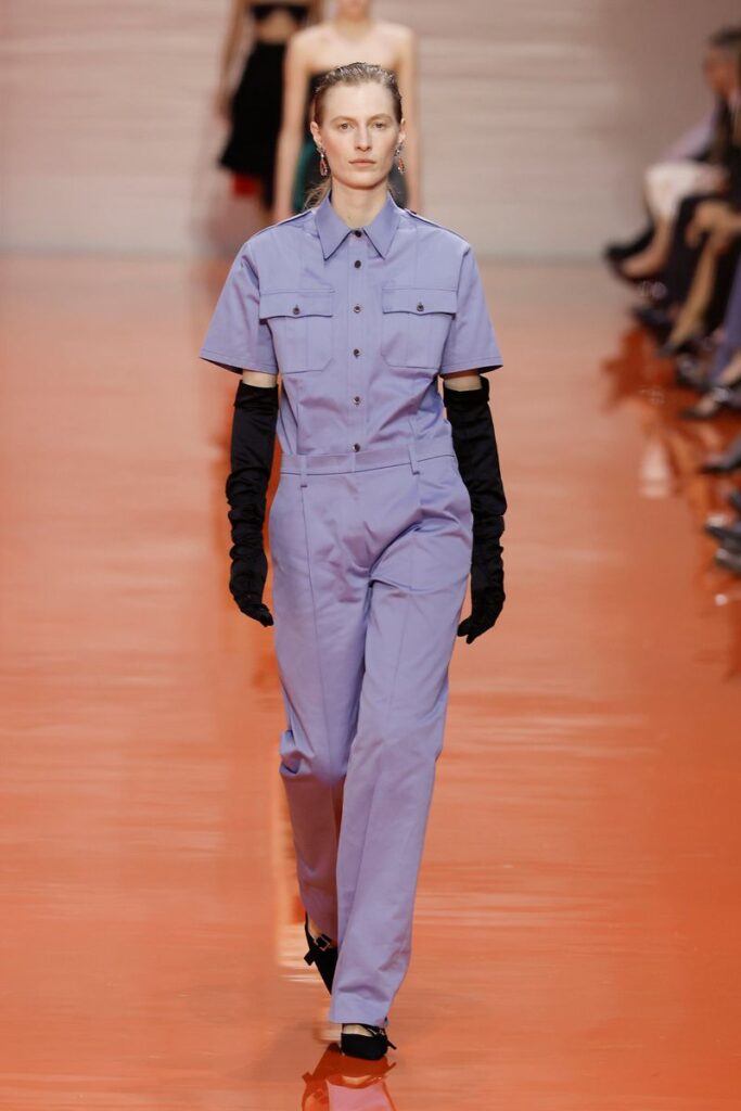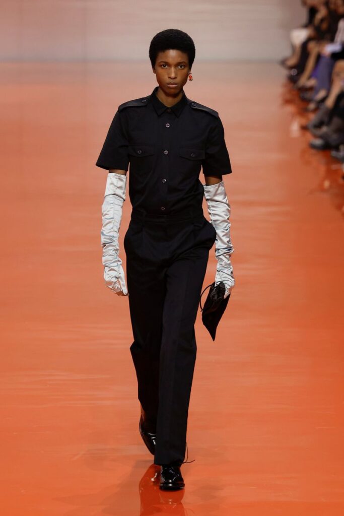 Miuccia descreveu o uniforme como proteção, Raf lembrou do pai vigia noturno; o uniforme como cuidado, não guerra. Do choque nasce a sintaxe: camisa boxy + luva de ópera, saia colada como colagem cirúrgica, trench cinza com tafetá ácido. O que parecia erro vira método, o que parecia bagunça vira gramática, honey. Prada entrega uma nova elegância, não nostálgica, mas convenhamos, é recombinada. É glitch com disciplina suíça e malícia carioca. É de abalar Bangu e adjacências!