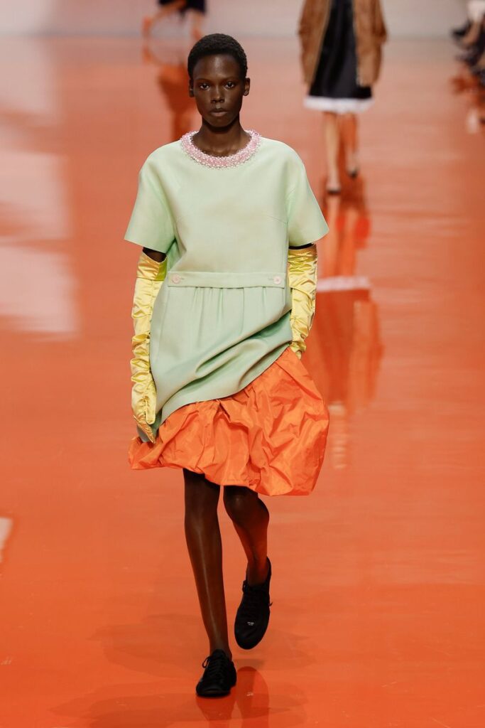E o cenário? Ah, mon petit órfãos de Orange is the New Black; o cenário… um piso laranja espelhado que mais parecia pista de dança de forró em Martinho Campos. O reflexo saturava tudo, transformando o cinza burocrático em prata sci-fi. Prada programou condições óticas para reconfigurar percepção cromática. Deus me FREE se isso não é genialidade.