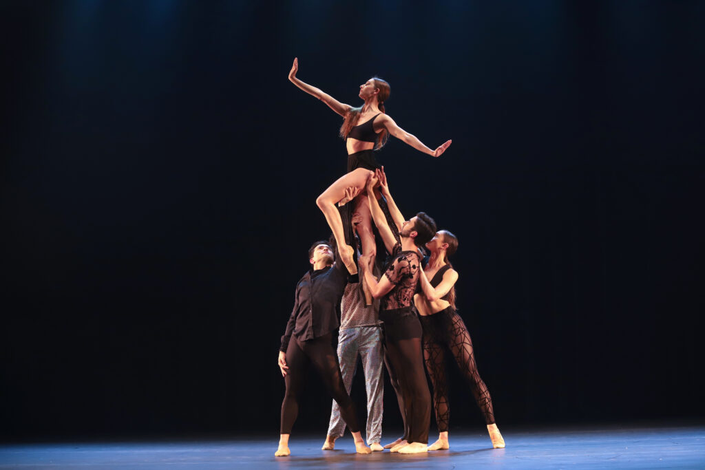 Na parte de baixo, um microshort estruturado serve de base para longas tiras de tecido que descem pelas pernas. A cada passo, essas faixas deslizam e chicoteiam o ar, como se Bella fosse uma ginasta rítmica de outro planeta. O movimento do tecido dialoga com os bailarinos da Cisne Negro que surgem na sequência, criando um circuito visual entre dança e passarela. O styling se completa com uma faixa de cabeça no mesmo print, amarrando o visual de maneira quase tribal futurista, e botas pretas de salto fino que seguram a feminilidade afiada da composição.