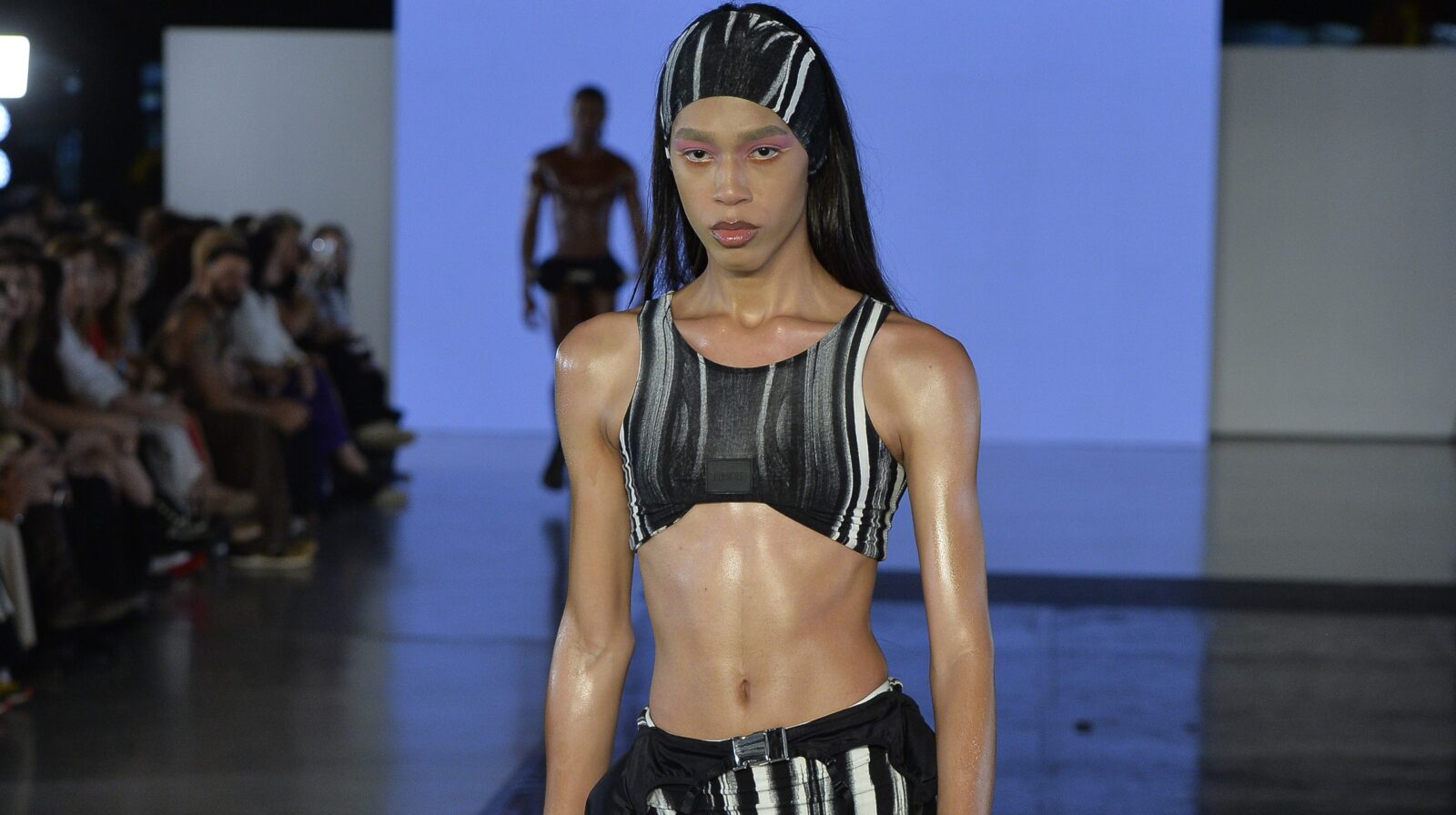A cena é cinematográfica. Iluminação fria, passarela escura, o fundo azul em clima de performance. Antes mesmo da primeira pirueta dos bailarinos da Cisne Negro, entra ela, magra como uma linha de desenho, pele brilhando como quem acabou de escapar de um treino olímpico, top esportivo gráfico em preto e branco, shorts de tiras que voam em volta das pernas, faixa na cabeça, bota de salto que não tem medo de nada, honey Lee de Xique-Xique. É Bella quem abre o desfile, é Bella quem abre a temporada, é Bella quem crava ali um novo capítulo da moda brasileira com um corpo que carrega três palavrinhas que ainda assustam muita gente: trans, indígena, nordestina. Atura ou surta, bebê.