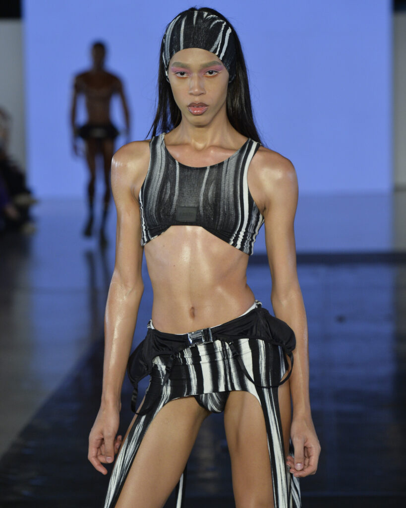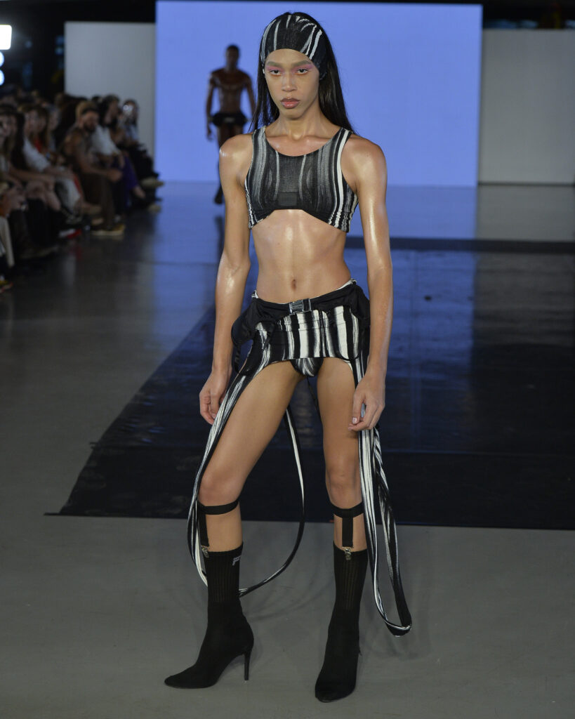 No line-up da 57ª edição, um desfile chamava atenção: o de Le Benites, criado como uma performance em diálogo com a Cisne Negro Cia de Dança. O estilista, que tem biografia atravessada pela frustração de não ter seguido carreira de bailarino clássico por não se encaixar no padrão exigido, decidiu transformar essa memória em moda. A coleção gira em torno de atletismo, treino, corpo em movimento, sensualidade e disciplina. As peças parecem figurinos de balé contemporâneo passados por um filtro de academias urbanas e clubes underground. Há regatas cavadas, macacões colados, shorts e calças com elásticos esportivos, malhas que lembram segunda pele de atleta e detalhes que flertam com underwear fetichista.