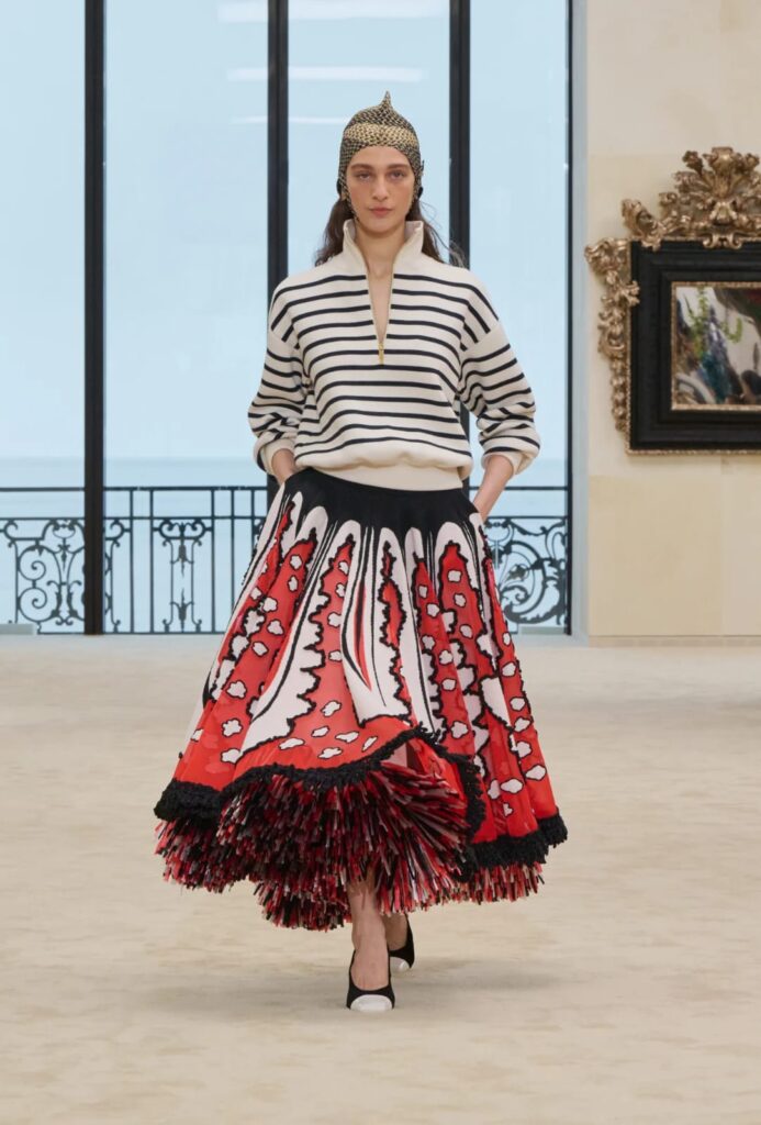 E foi justamente isso que senti nessa primeira Cruise Collection de Matthieu Blazy para a maison, apresentada em Biarritz: uma Chanel menos museológica, menos engessada no próprio altar, menos refém da reverência automática. Uma Chanel com sal. Com vento. Com pele. Com corpo. Com mar. Com humor. Com história. Com desejo. E, sim, com uma brasilidade fina atravessando a coleção como brisa atlântica, sem precisar vestir uma palmeira na cabeça para abalar Bangu e adjacências…