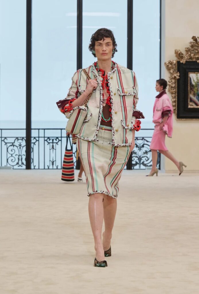 A lona de algodão lavada aparece como antídoto contra o excesso de preciosismo. Ela dá à Chanel uma aparência de uso, de viagem, de roupa que saiu do salão e viu a luz do dia. A seda foulard, por sua vez, constrói os momentos mais fluidos e gráficos da coleção: vestidos de listras, conjuntos soltos, camisas com lenços, amarrações, saias que parecem pareôs sofisticados. A ráfia entra como som. Sim, som. Porque uma saia de ráfia não apenas se vê; ela sussurra no movimento.
