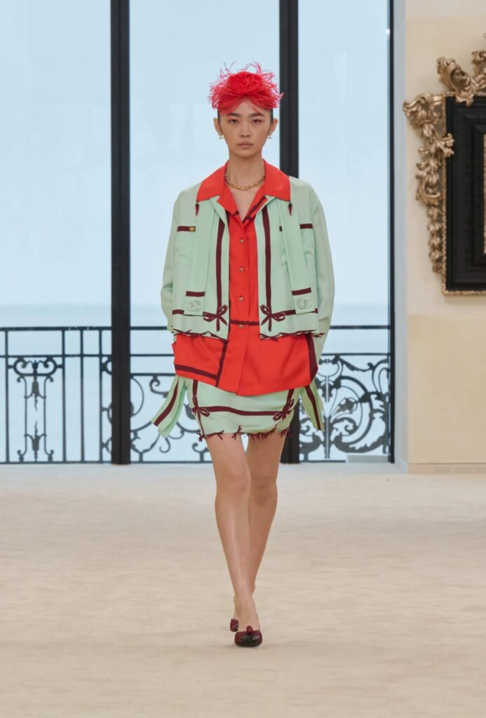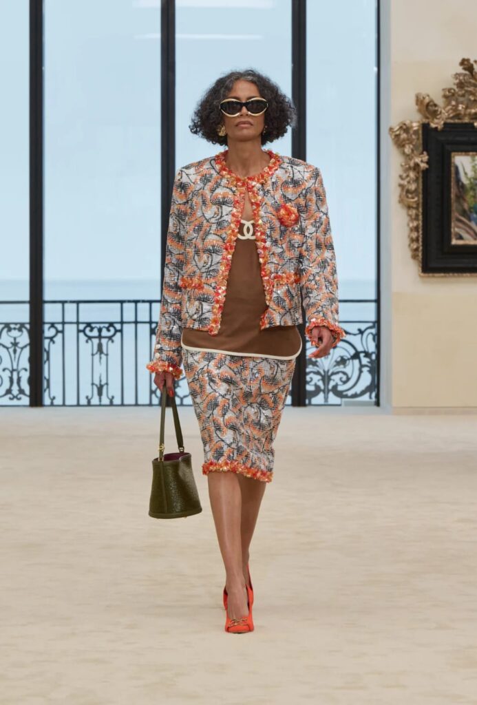 A cartela de cores faz a coleção caminhar do salão para a praia. O preto abre como algo palpável. O branco entra como respiro, pele, luz e contorno. O bege e os tons de areia criam continuidade com a arquitetura, com a praia, com a ideia de roupa lavada pelo tempo. O rosa aparece como doçura tensionada por estrutura. O vermelho aquece e dramatiza. O azul traz mar e horizonte. O turquesa final cristaliza a água. O verde, quando surge, injeta vida quase inesperada. As estampas vibrantes quebram a solenidade e fazem Chanel parecer menos intocável.
