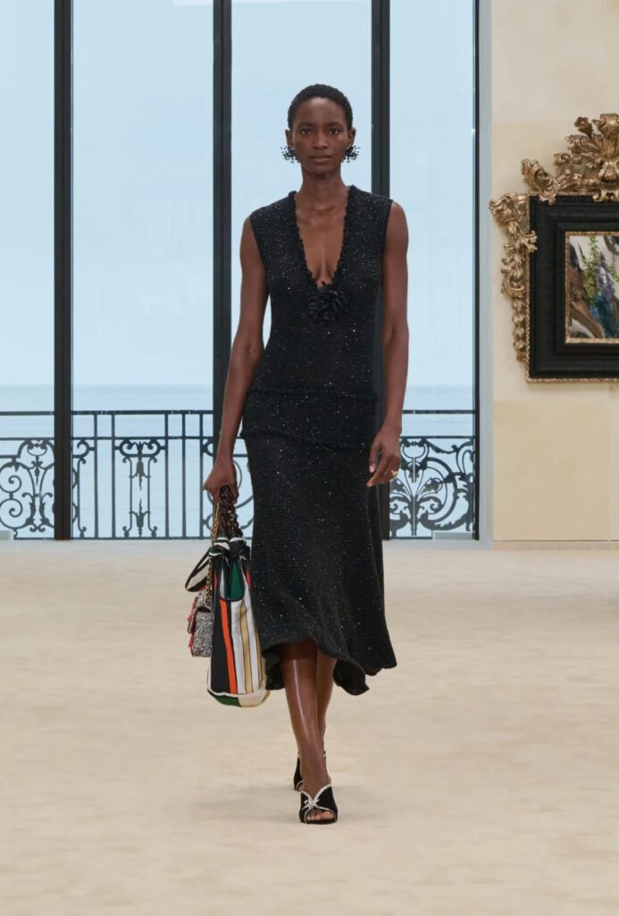 A própria Chanel define a coleção dizendo que “o pequeno vestido preto continua se reinventando” e que o duplo C atravessa silhuetas em movimento, de conjuntos fluidos em seda foulard a saias de ráfia e tailleurs em lona de algodão lavada. Essa frase oficial é importante porque revela a espinha dorsal do desfile: assinatura e movimento, manifesto e matéria, arquivo e praia.