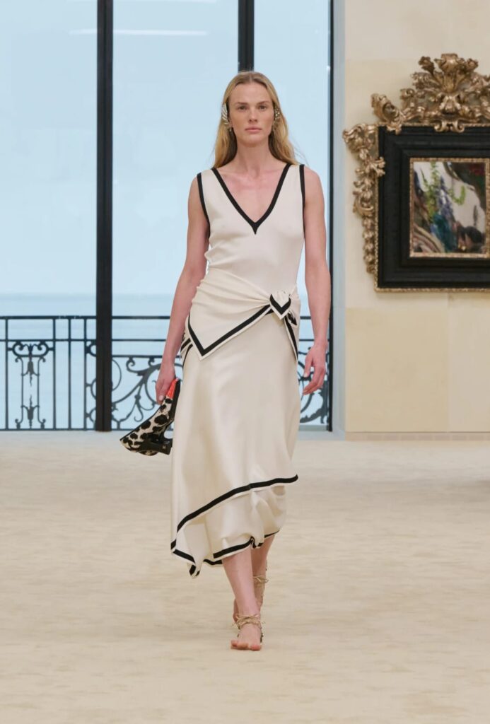 Ele aparece no vestido branco com viés preto, amarrado na cintura, com fenda e movimento de pareô sofisticado. Aparece no vestido preto de franjas e textura, que caminha como noite molhada. Aparece no conjunto rosa, quase doce, mas cortado por estrutura e atitude. Aparece no tailleur vermelho com fenda, que faz o clássico sair do gabinete e ir direto para o calor. Aparece nas camisas listradas com bermudas, nos casacos amplos, nos tops de praia, nas saias de ráfia que balançam como se tivessem ouvido música antes de entrar na passarela… que delicinha!